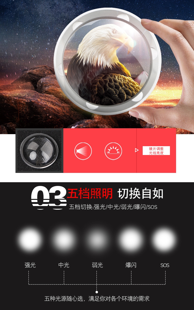 1、六档调光,可满足不同使用场景下的照明需求。 2、进口高亮朗明纳斯灯珠,照明效果更好。 3、含档位记忆,任意档位快捷关机 ,开机恢复关机前档位。