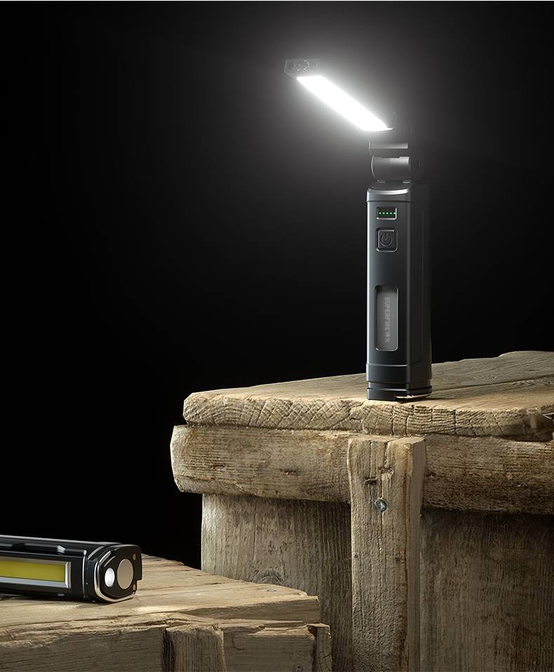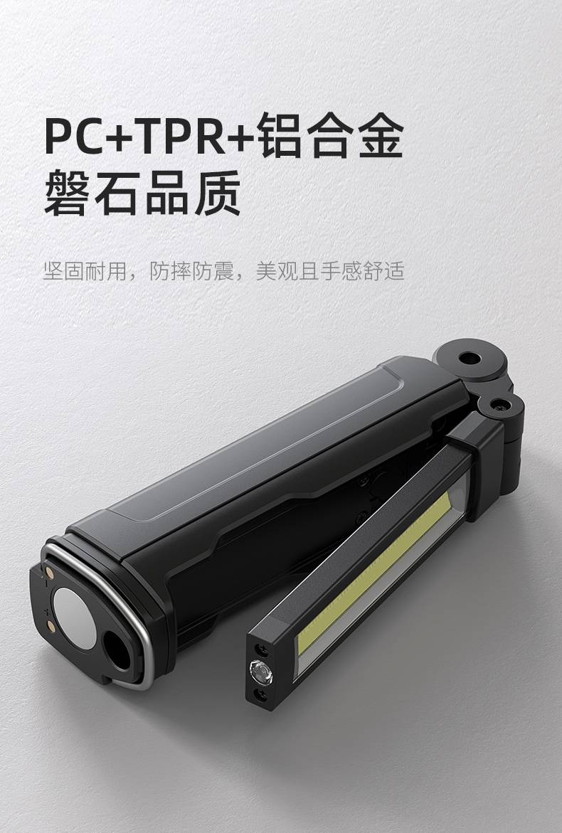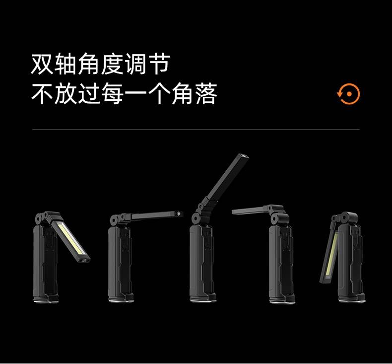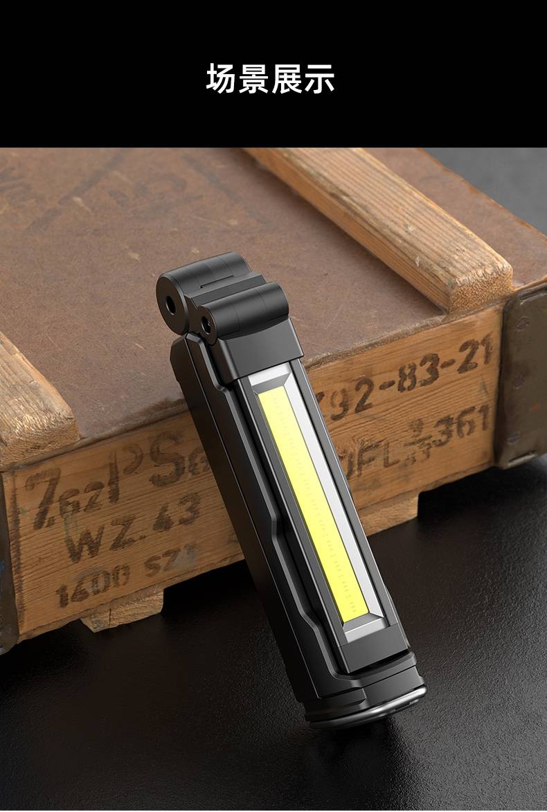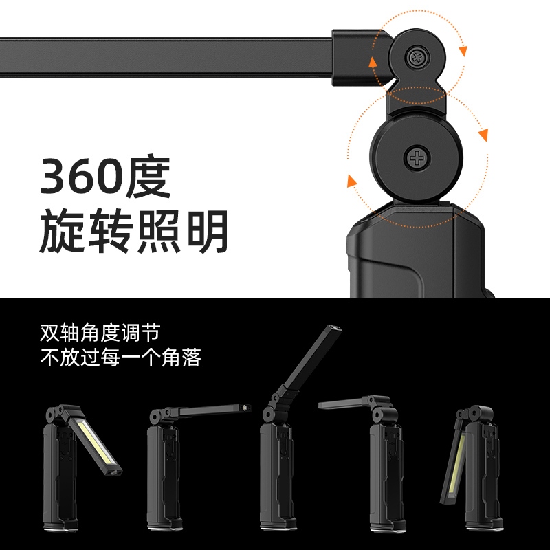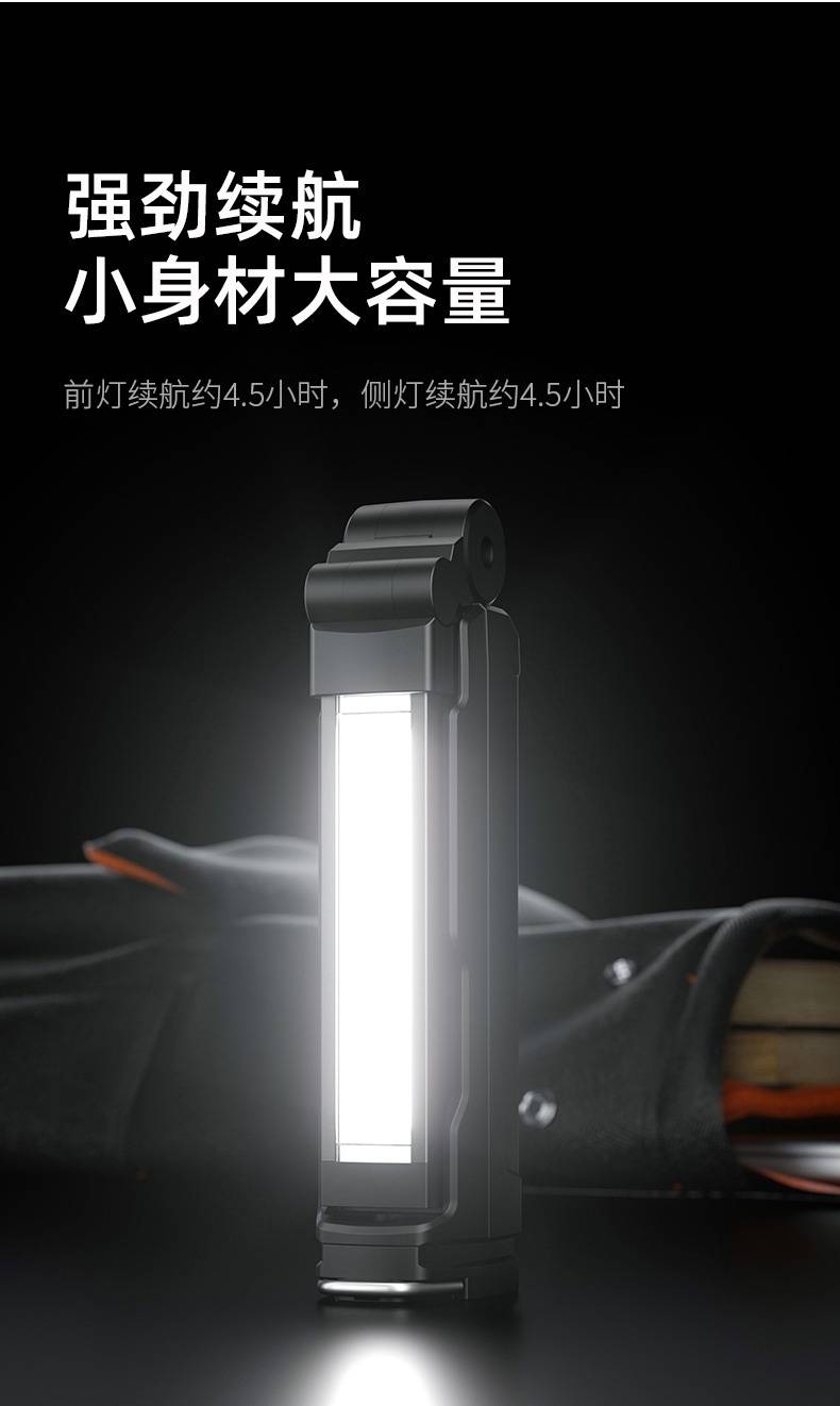 1、此款工作灯有记忆功能,自动记忆上次关闭前的光源及档位; 2、设有电量指示灯,电量情况一目了然; 3、此手电设有磁吸、挂扣及伸缩固定架,多种固定方式满足工作需求.