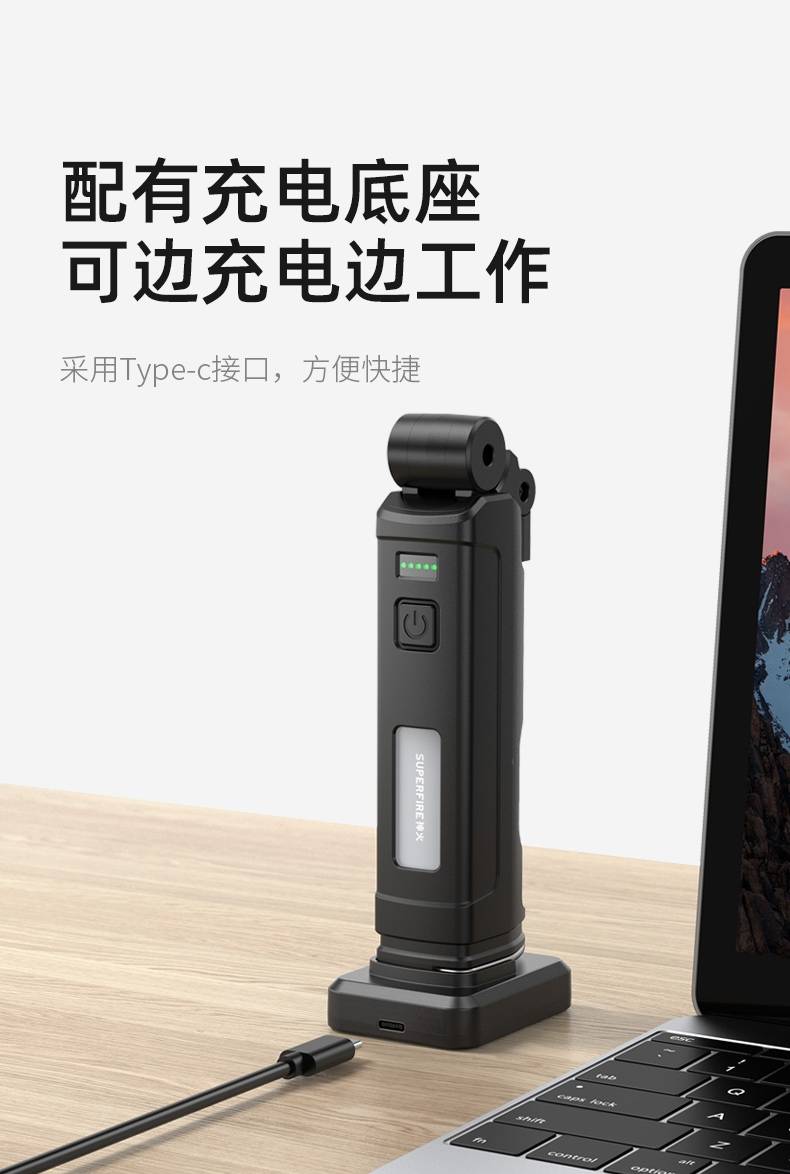 1.单击左边开关开启感应功能,同时开启强光档,续按关闭感应功能(关闭感应功能,光源不会关闭),当感应功能开启时,单击右边开关可正常调节档位。 2.多样化充电,使用方便:设有Type-c充电口,可使用充电器、充电宝、电脑等设备为灯具充电。 3.电量显示:实时
