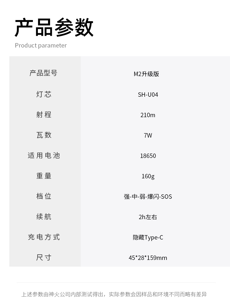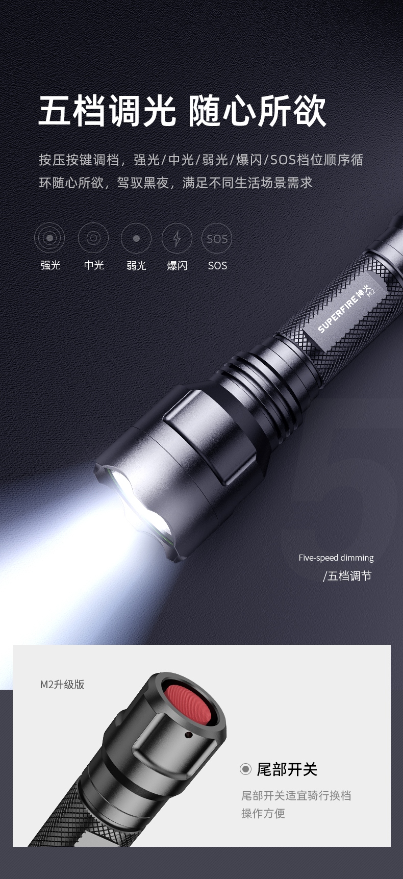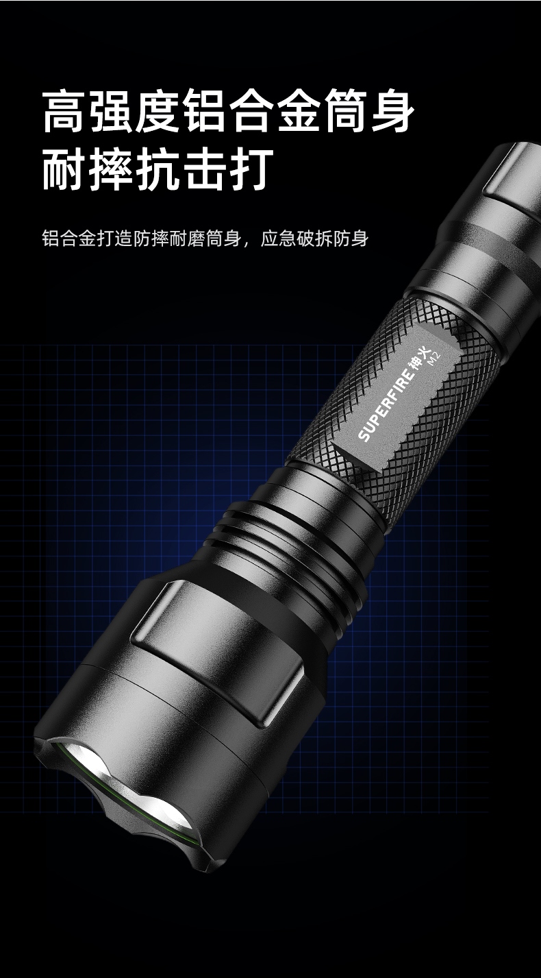 1、千米远射,射程更远,光斑更聚焦。 2、进口灯珠,亮度高,照明效果更好。 3、前后双按键,光源一键点亮,高亮瞬间开启。