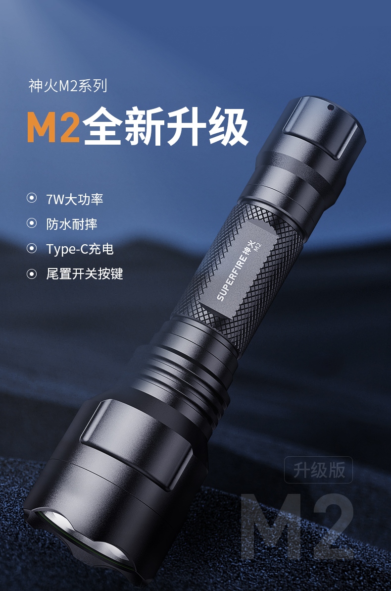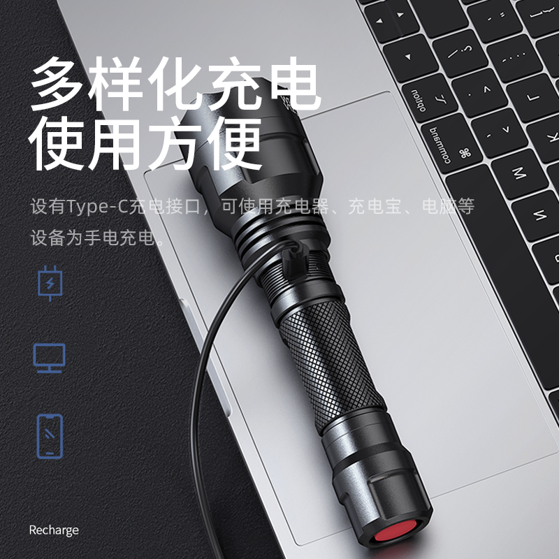 多样化充电,设有Type-C充电接口,可使用充电器、充电宝、电脑等设备为手电充电;设有省电程序,续航更持久