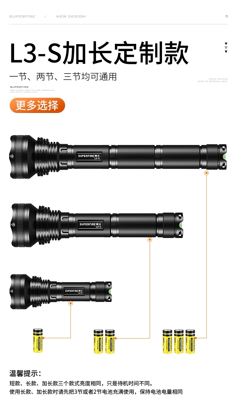强光远射手电,超长续航(手电可根据个人喜好调节长短),标配是两节两电,也可升级为三节三电。