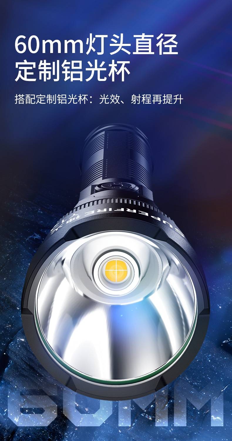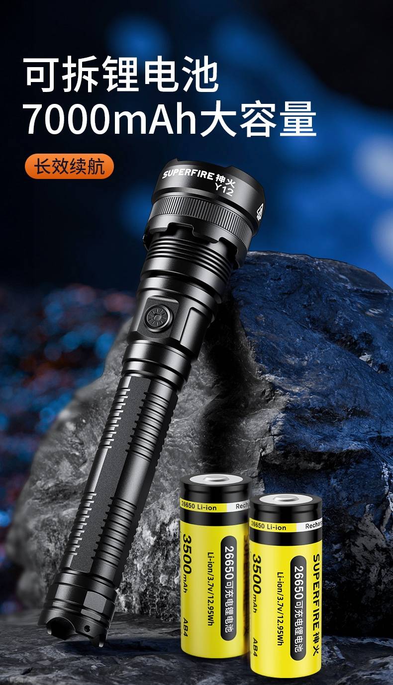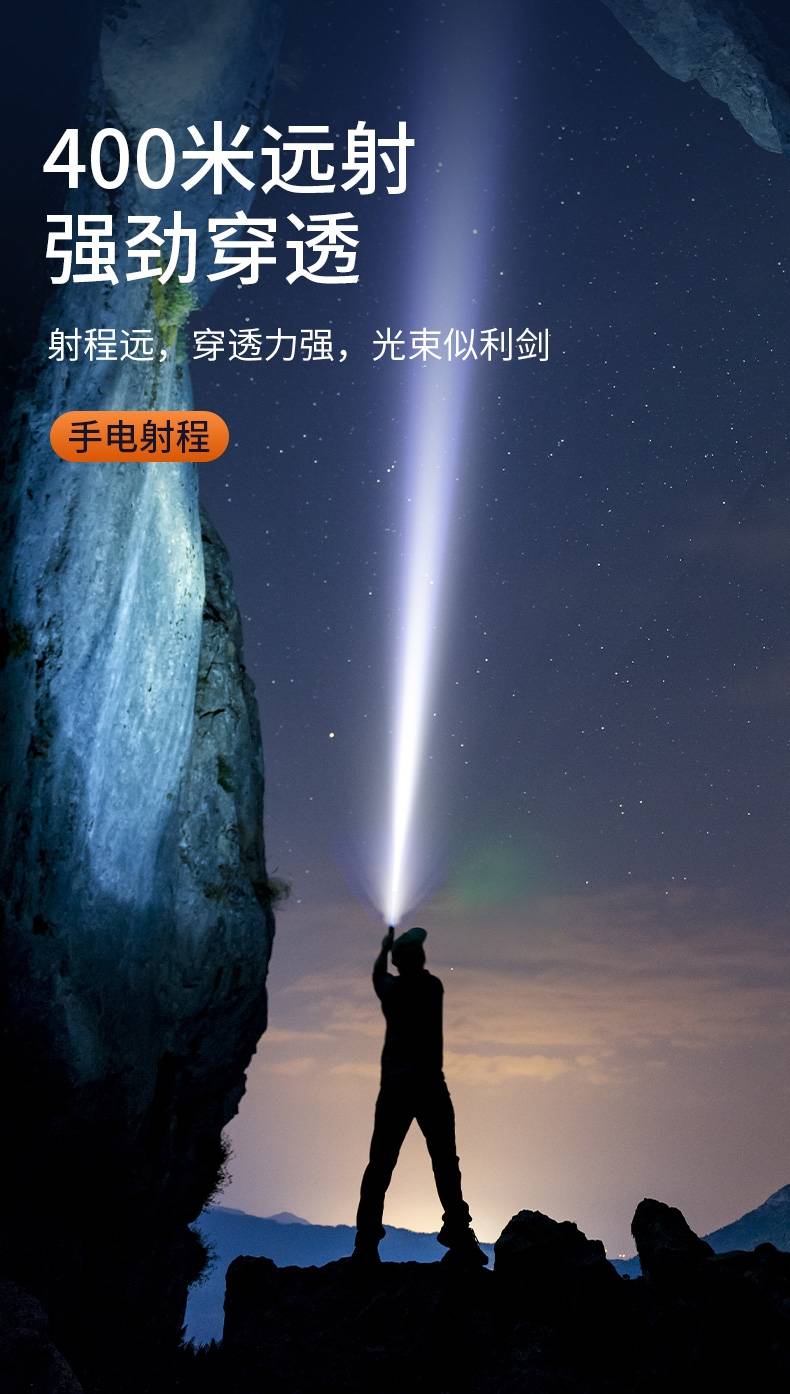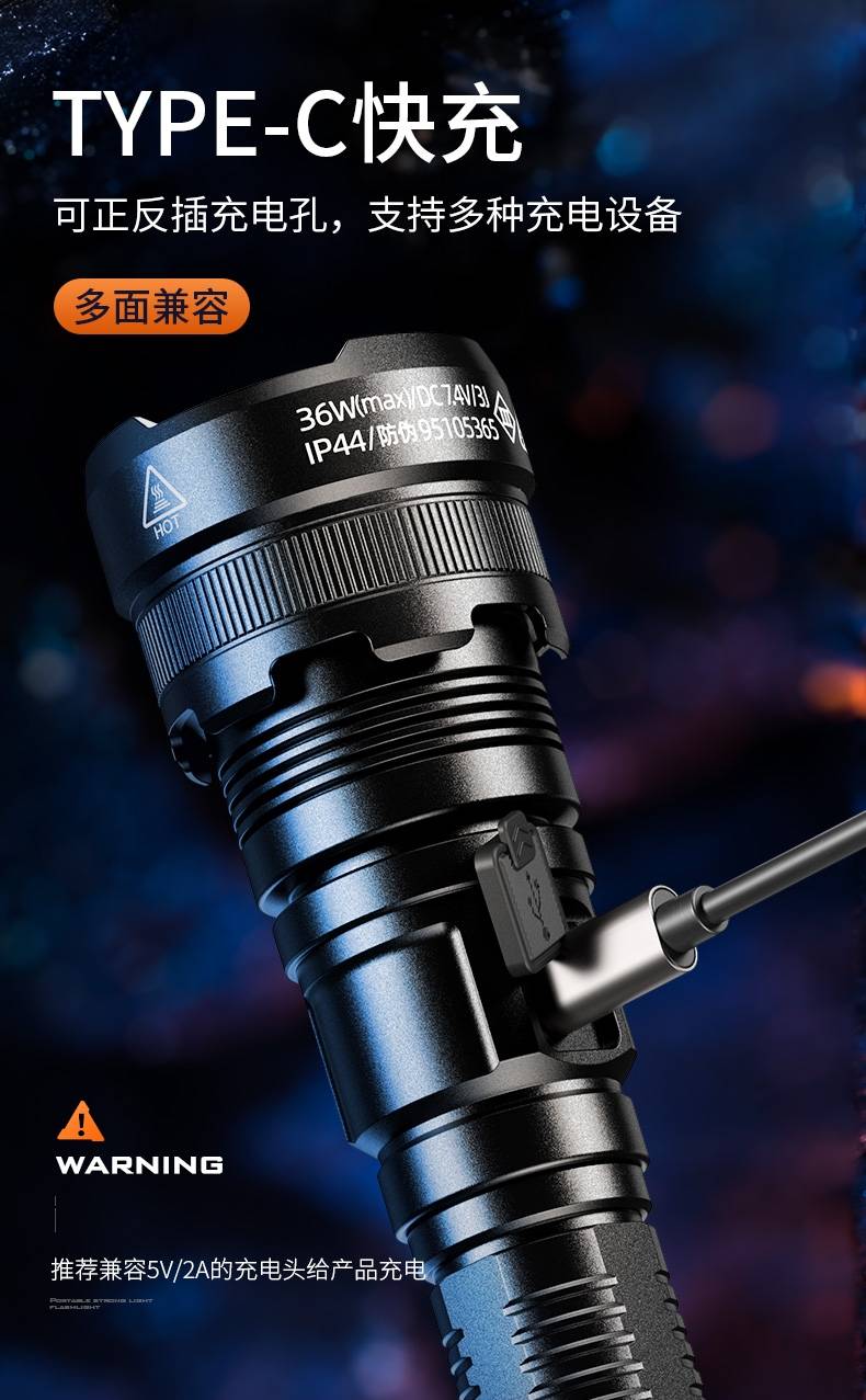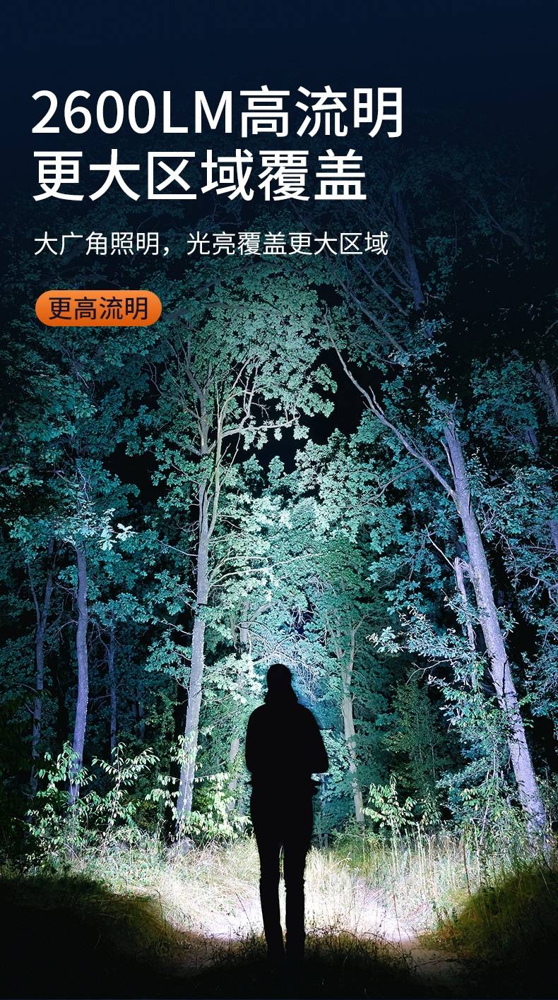 高亮远射,大功率灯芯;大容量,7000毫安充电锂电池;超长续航,高亮档可使用5.5H以上;