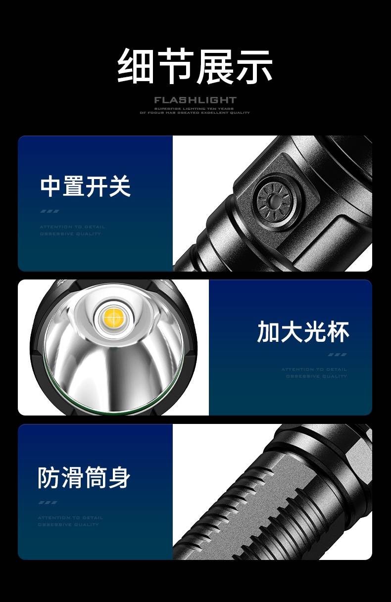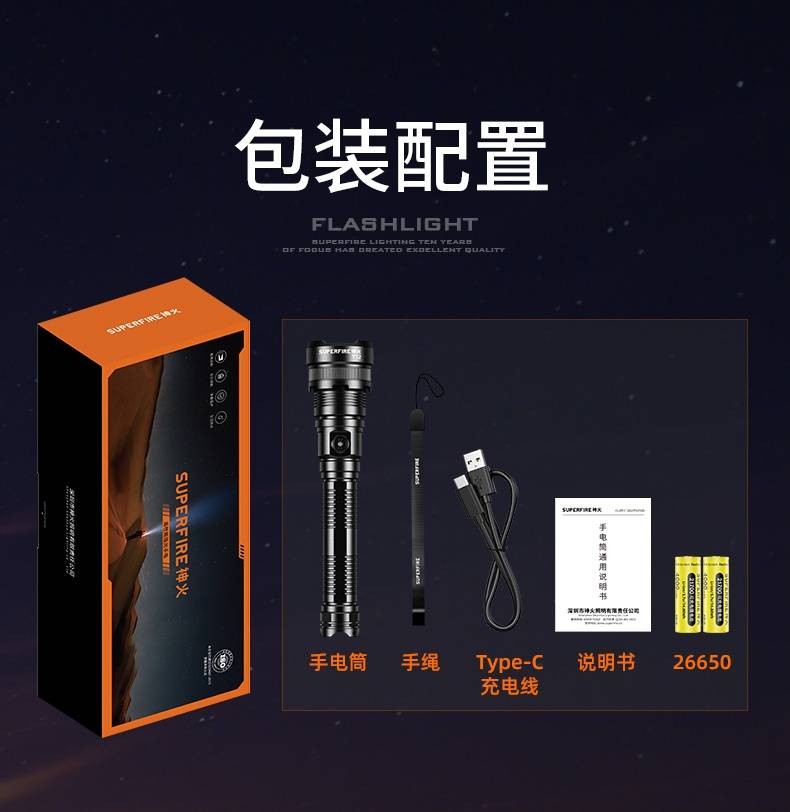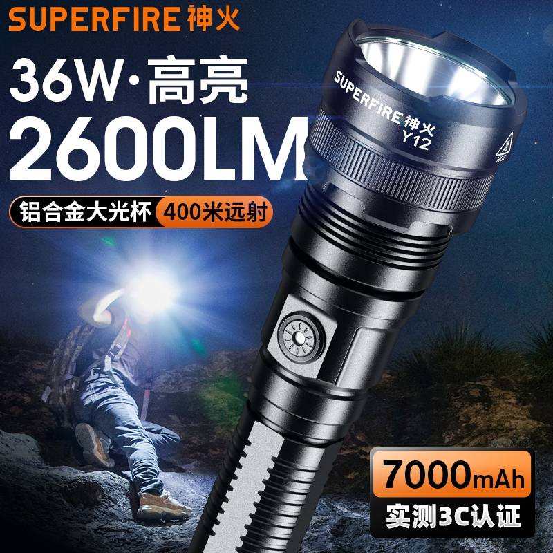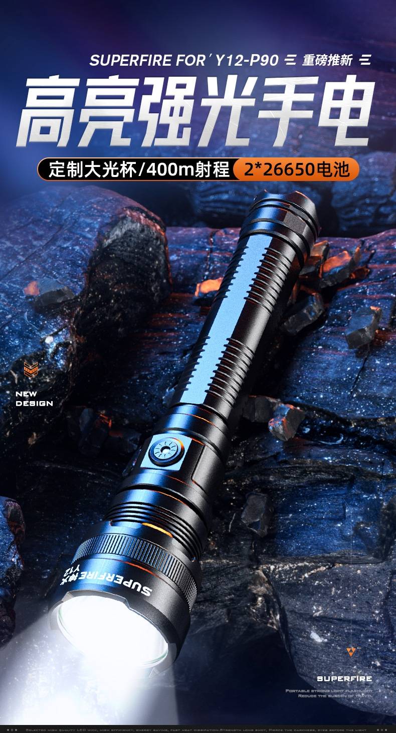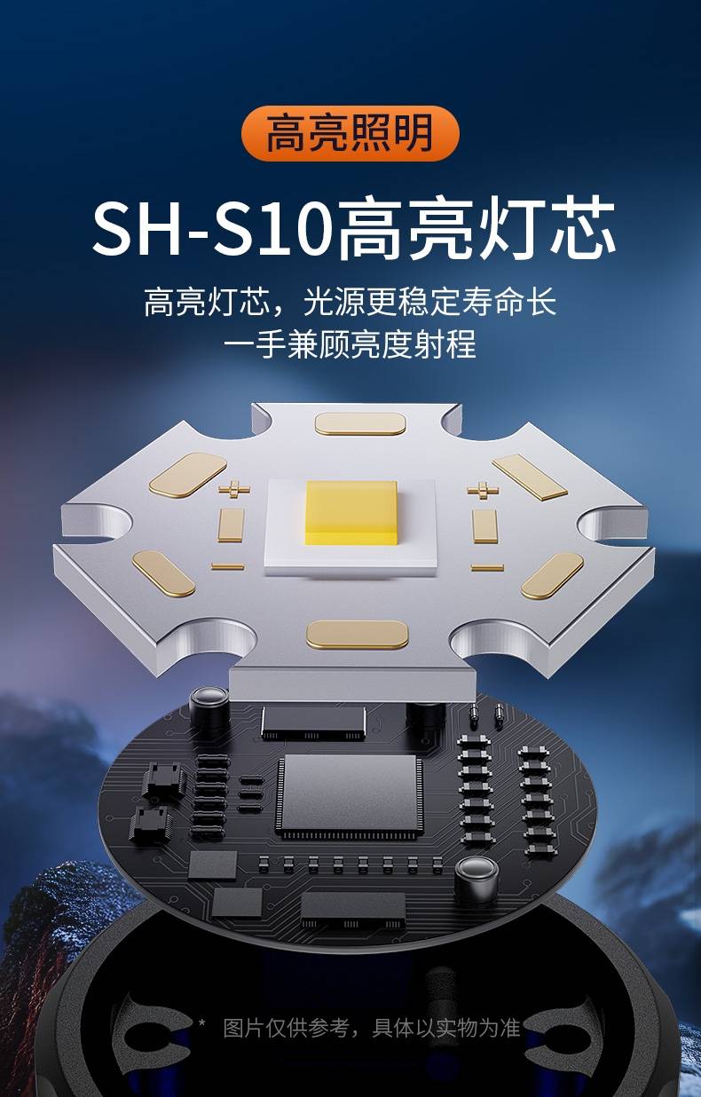 高亮远射,大功率灯芯;大容量,7000毫安充电锂电池;超长续航,高亮档可使用5.5H以上;