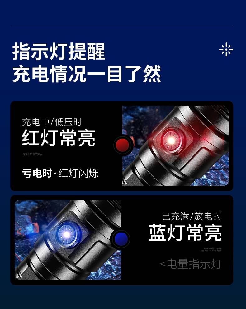 6、指示灯提醒,充电中/低压时红灯常亮,亏电时·红灯闪烁,已充满/放电时蓝灯常亮;
