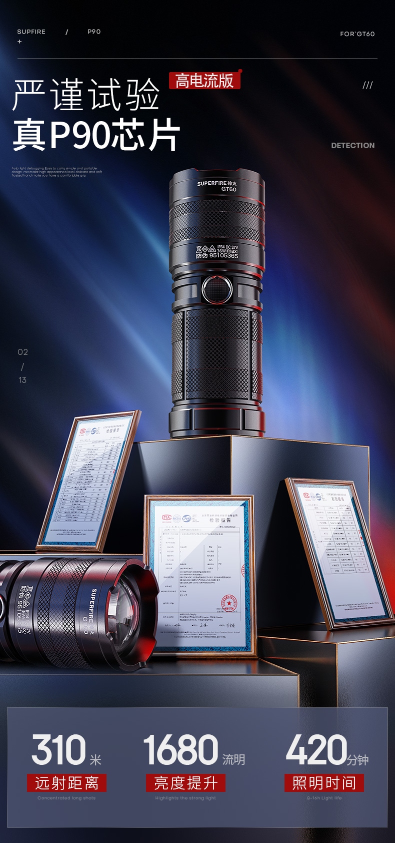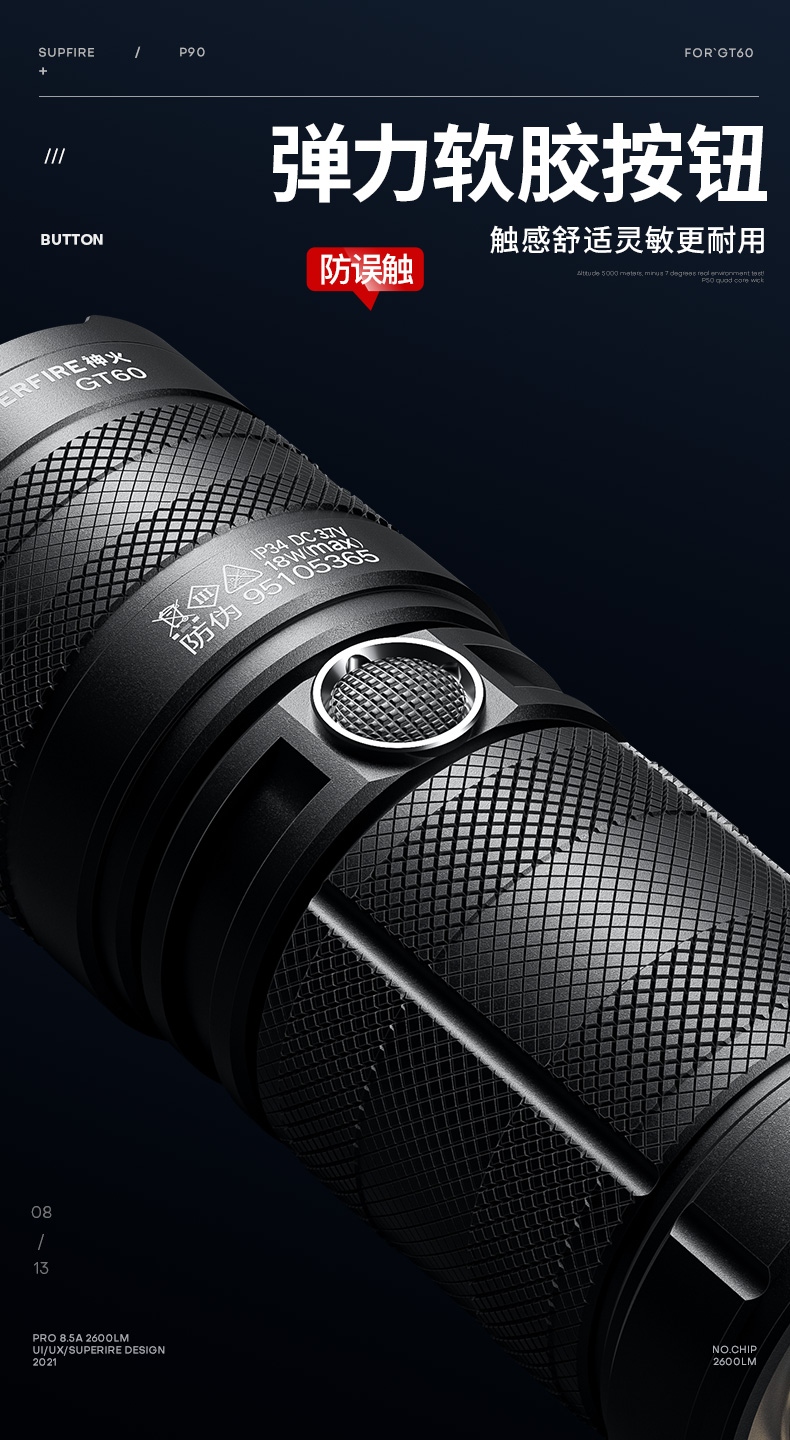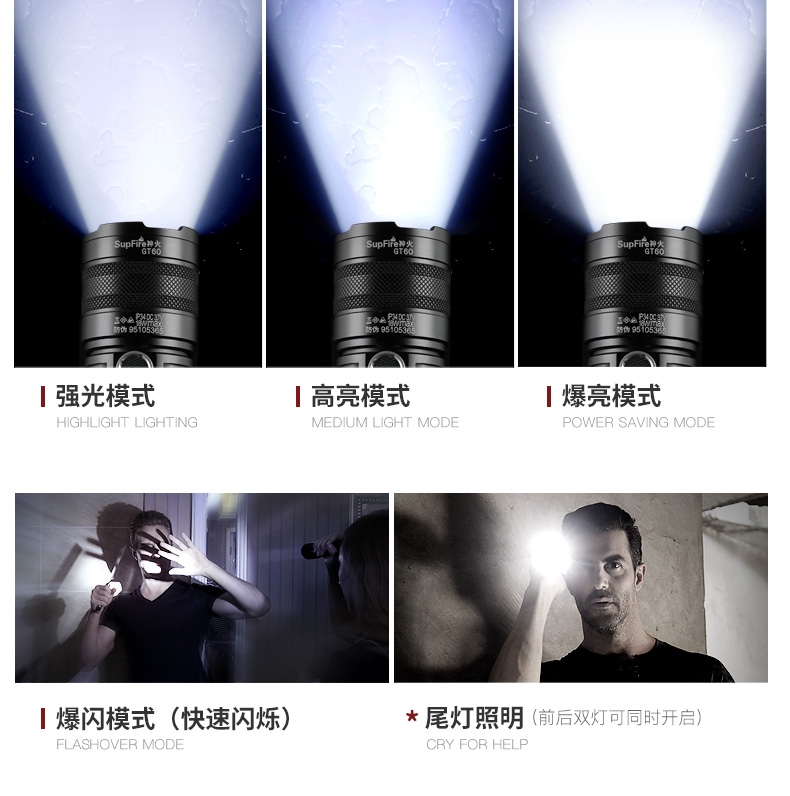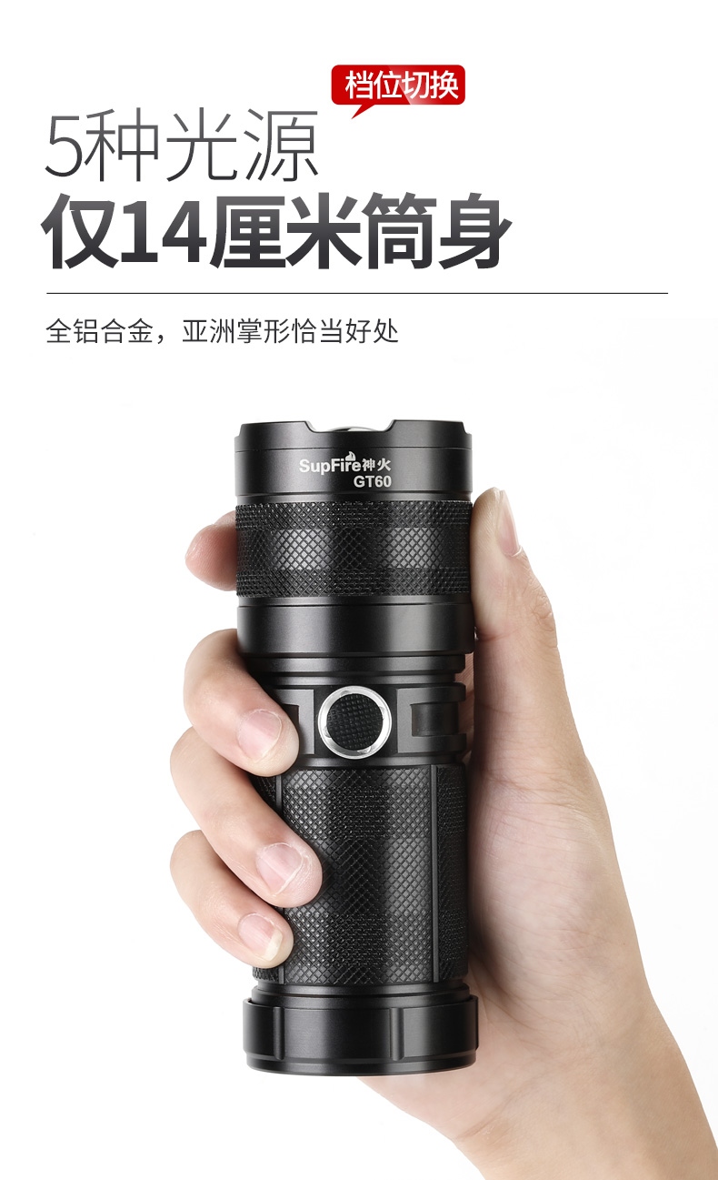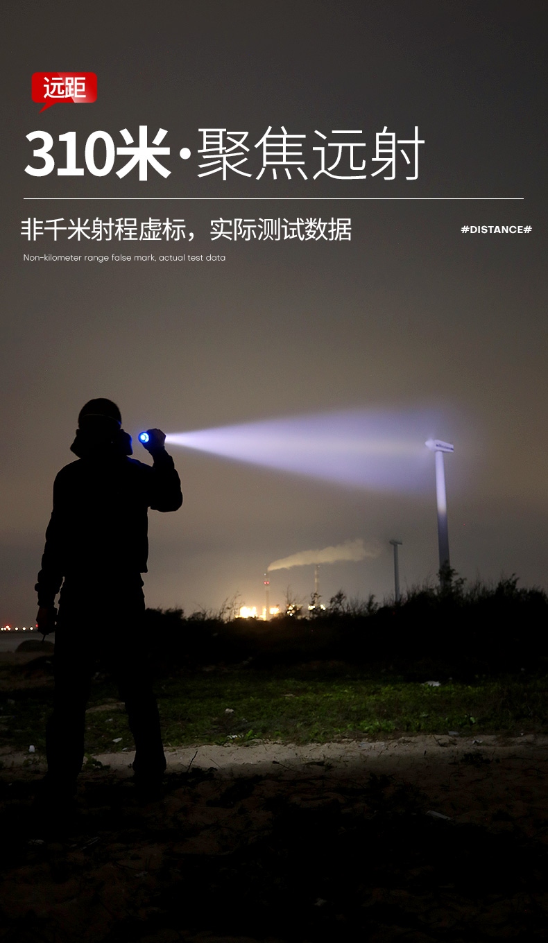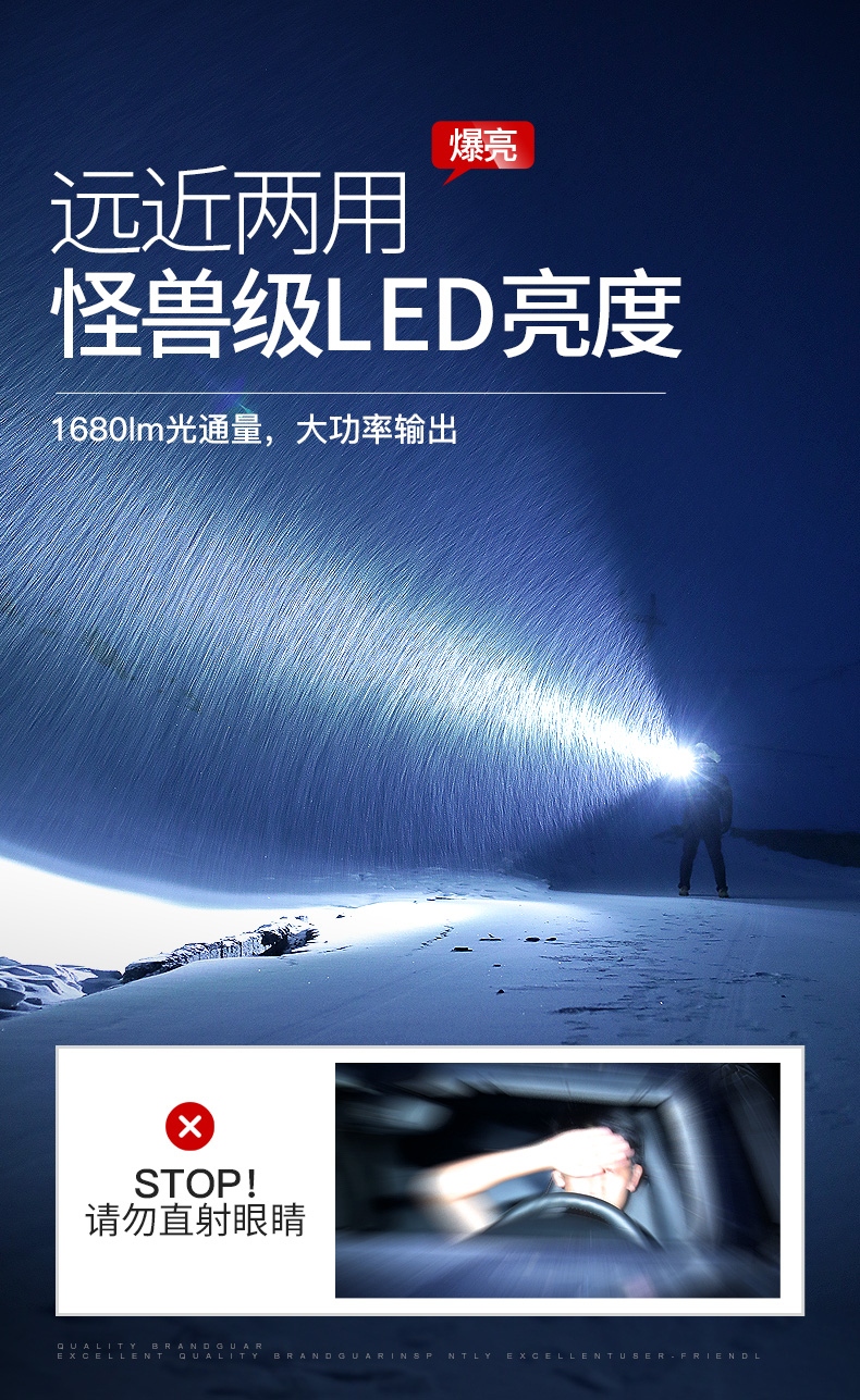 1、千米远射,射程更远,光斑更聚焦。 2、进口灯珠,亮度高,照明效果更好。 3、前后双按键,光源一键点亮,高亮瞬间开启。