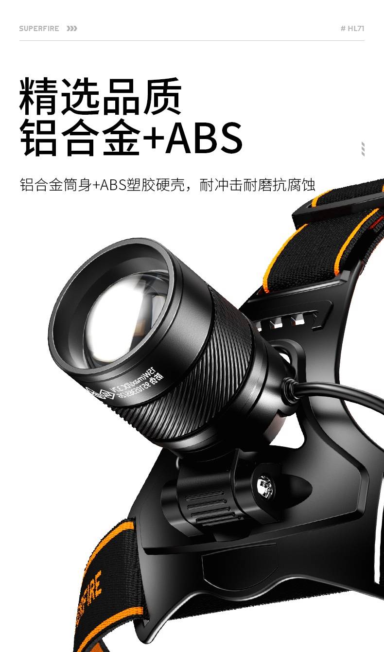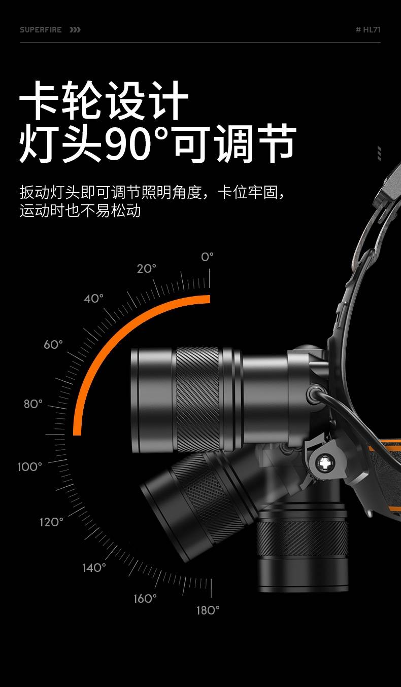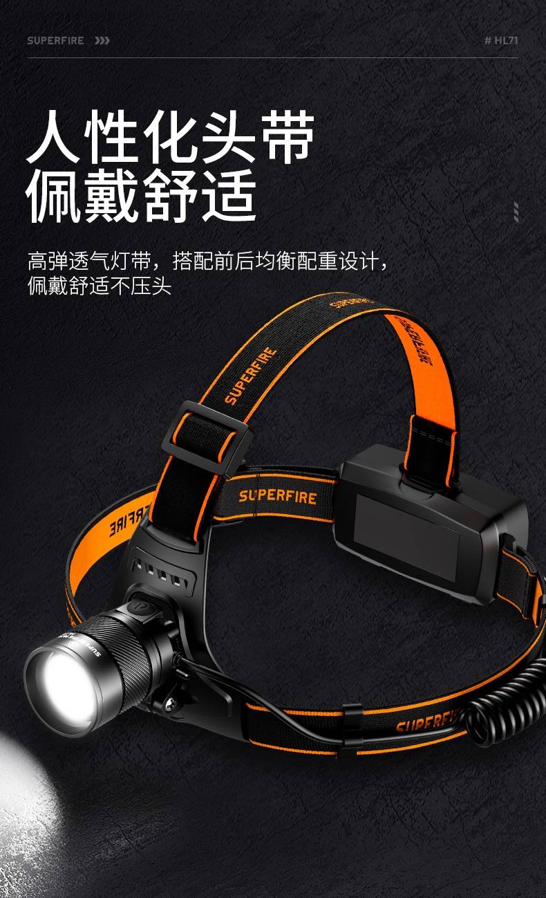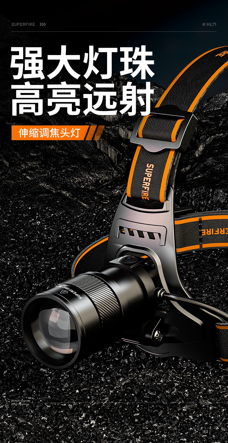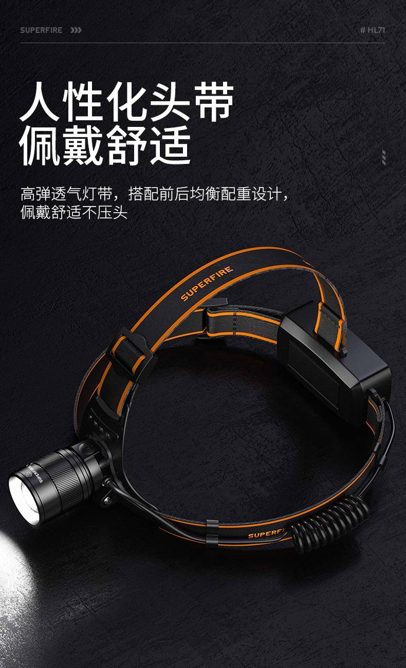 强光亮度,运动头灯,前后均衡设计,轻便不压头,可调节式头灯带,佩戴方便舒适,伸缩调焦,光照范围大,照射距离远,头灯角度调节,超90度角度随意调节,适宜各种环境使用