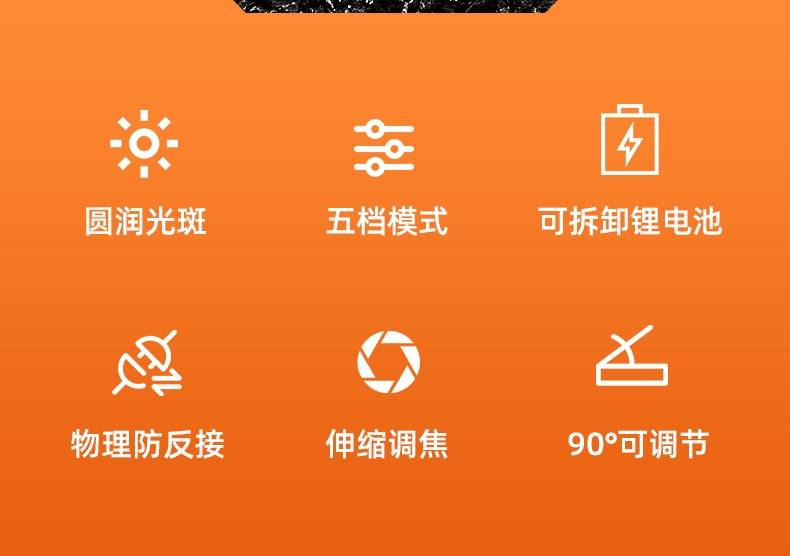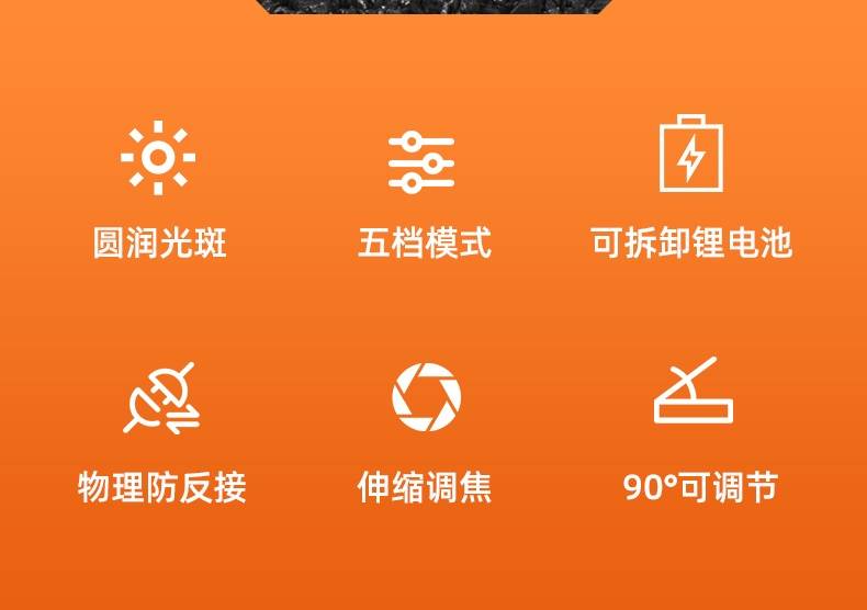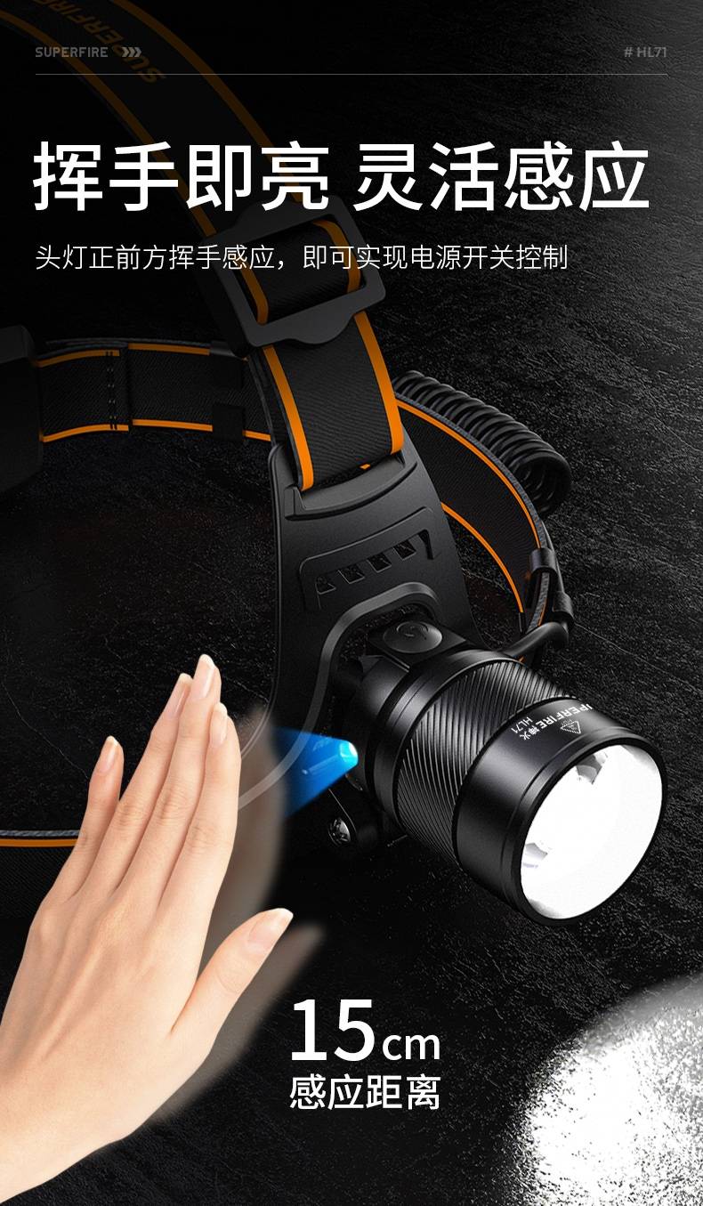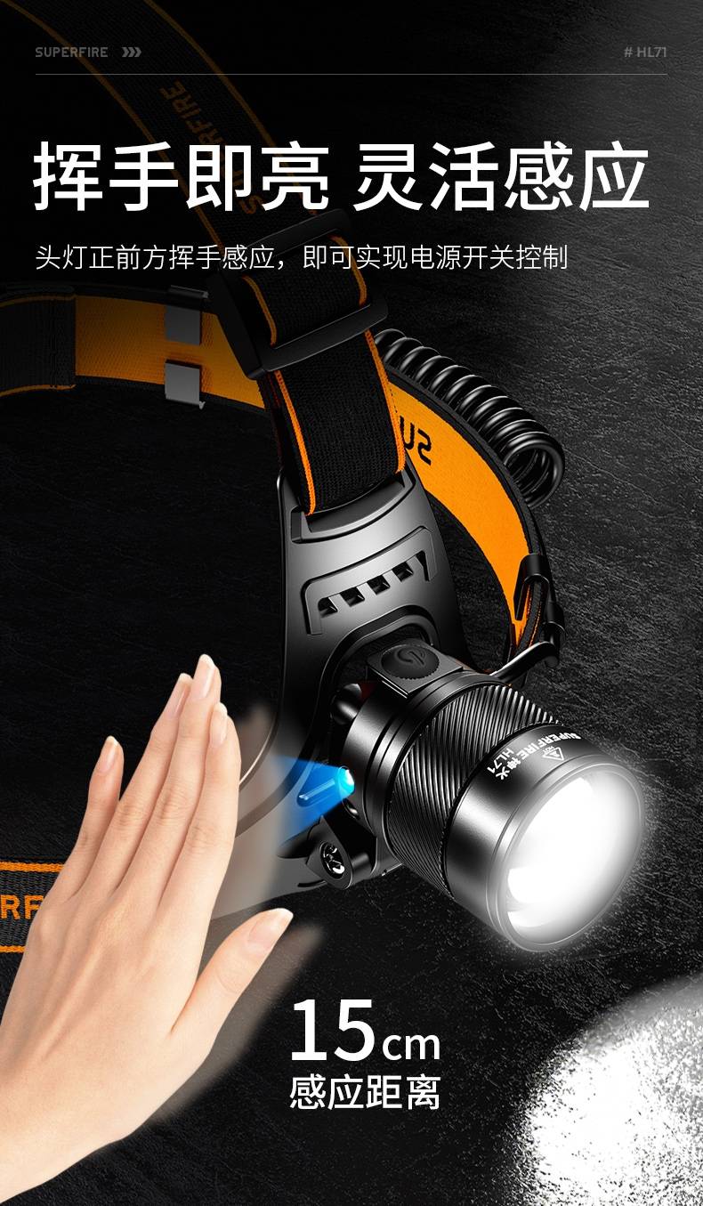 1、伸缩调焦头灯远近两用,可90度调节,;2、圆润光斑,视觉效果更好;3、头灯正前方挥手感应,即可控制电源开关;4、五档调节,一键切换。