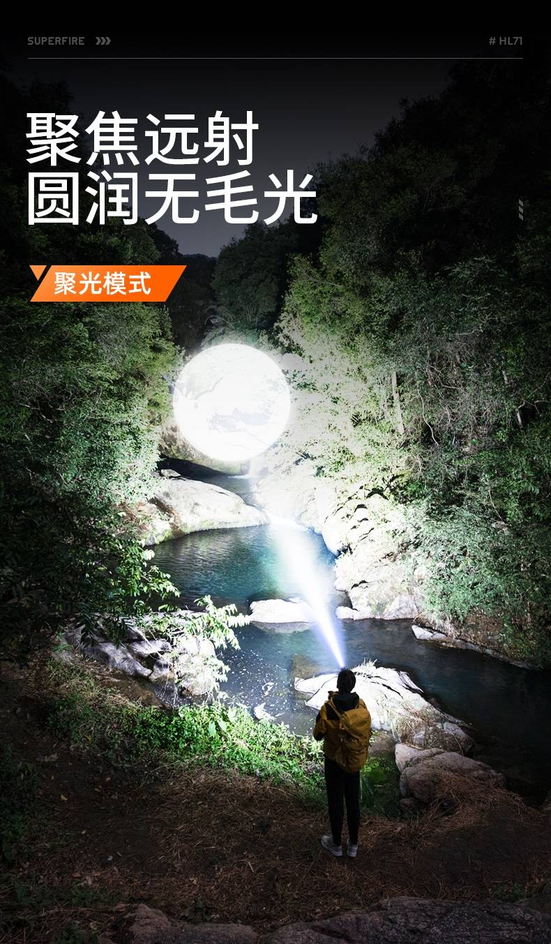 1、千米远射,射程更远,光斑更聚焦。 2、进口灯珠,亮度高,照明效果更好。 3、前后双按键,光源一键点亮,高亮瞬间开启。