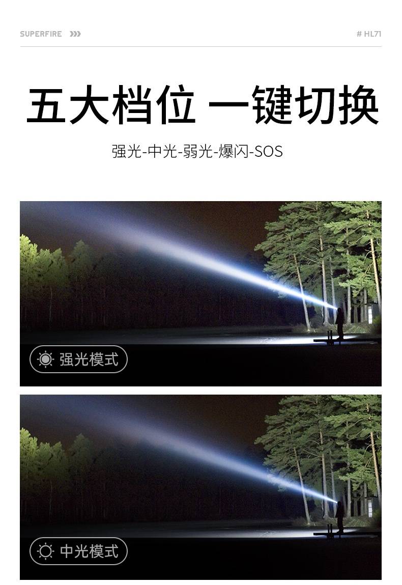 1、五档一体:强光--中光-弱光-爆闪-SOS-关