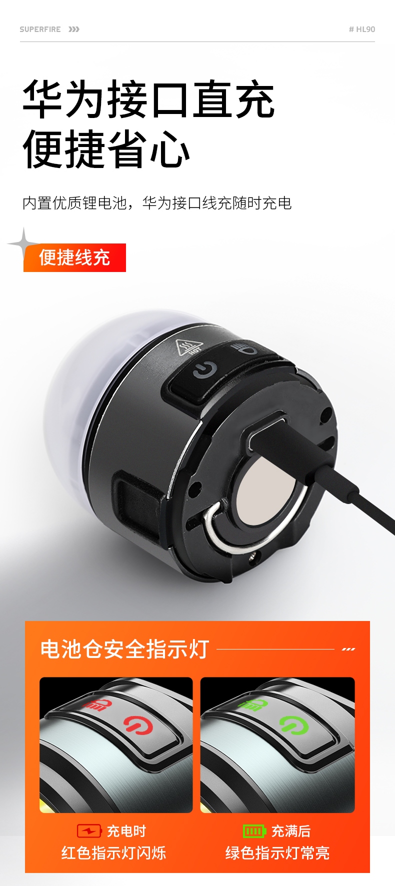 1.充电时红色指示灯常亮,充满时绿色指示灯常亮。 2.旋转拆卸头灯后盖, 可使用配套Type-c线进行充电。 3.拆卸头灯后盖,可使用磁吸及挂钩功能,秒变工作灯;搭配灯罩可变为迷你野营灯;头灯后盖含帽夹功能,可改为帽夹灯使用。