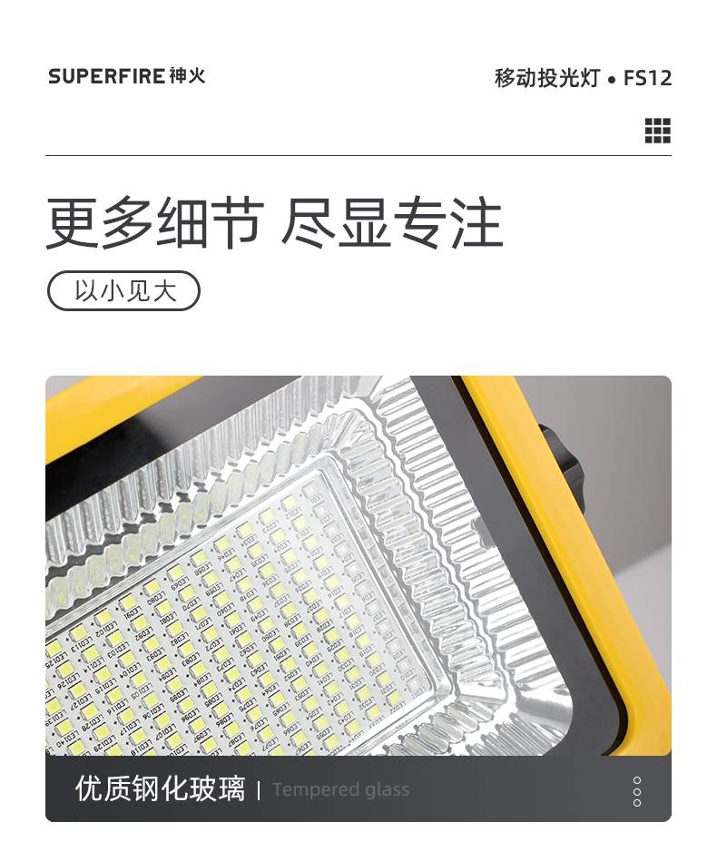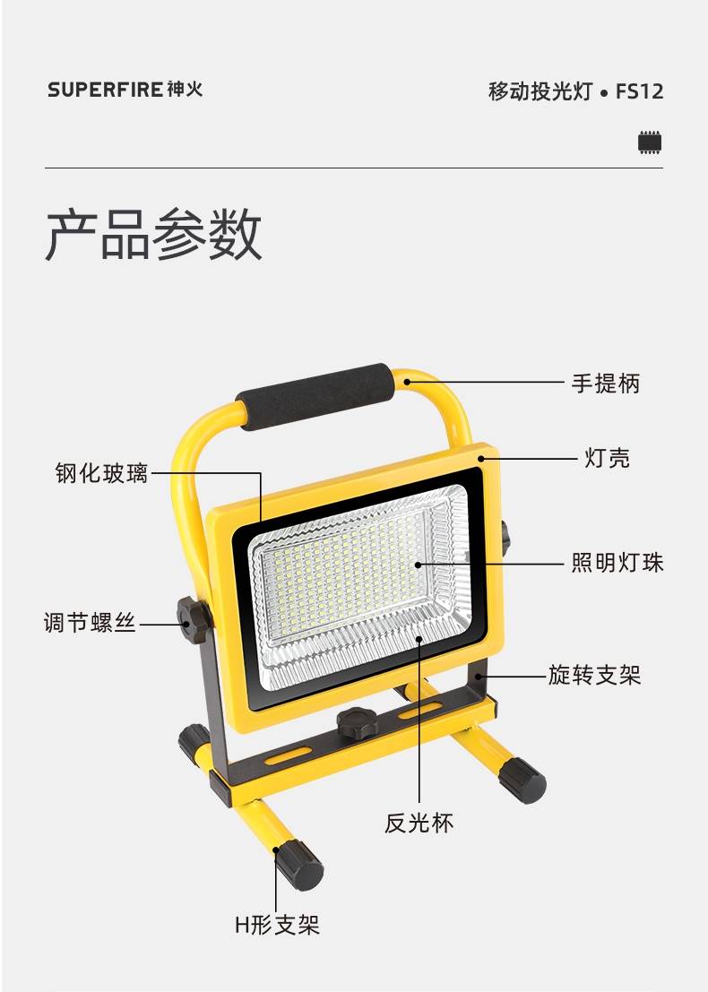 1、多档调光,可满足不同使用场景下的照明需求; 2、含提手,握感更舒适。携带更简单; 3、新型高亮远射灯珠,60W大功率,亮度高,照明效果好。