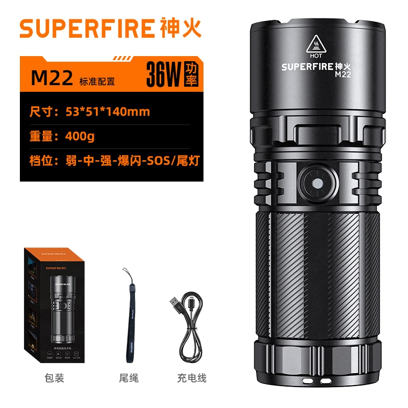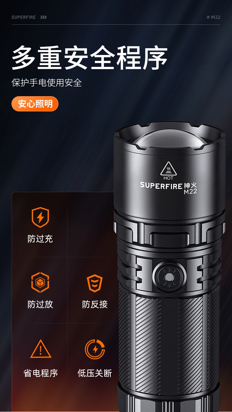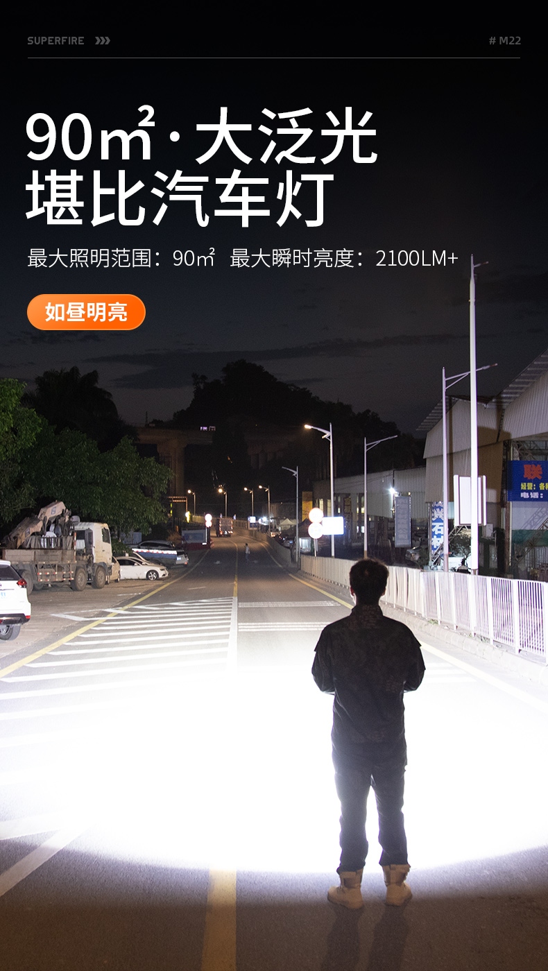 1、千米远射,射程更远,光斑更聚焦。 2、进口灯珠,亮度高,照明效果更好。 3、前后双按键,光源一键点亮,高亮瞬间开启。