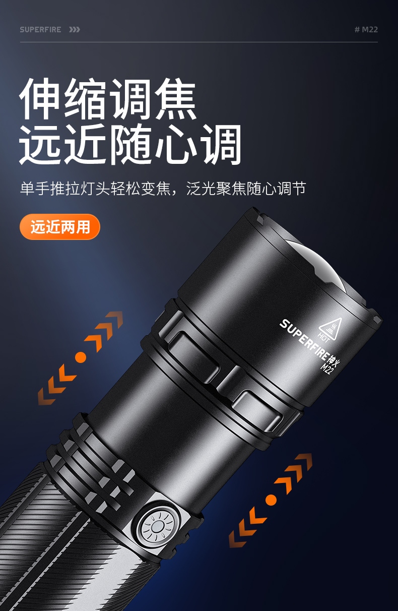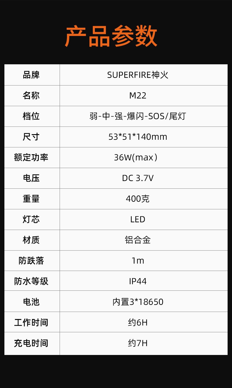 1、推拉灯头可实现伸缩调焦。2、36W大功率,亮度高,照明效果好。3、前后双灯,可满足多种环境下照明。4、最高约6H续航,有效满足长时间照明使用。