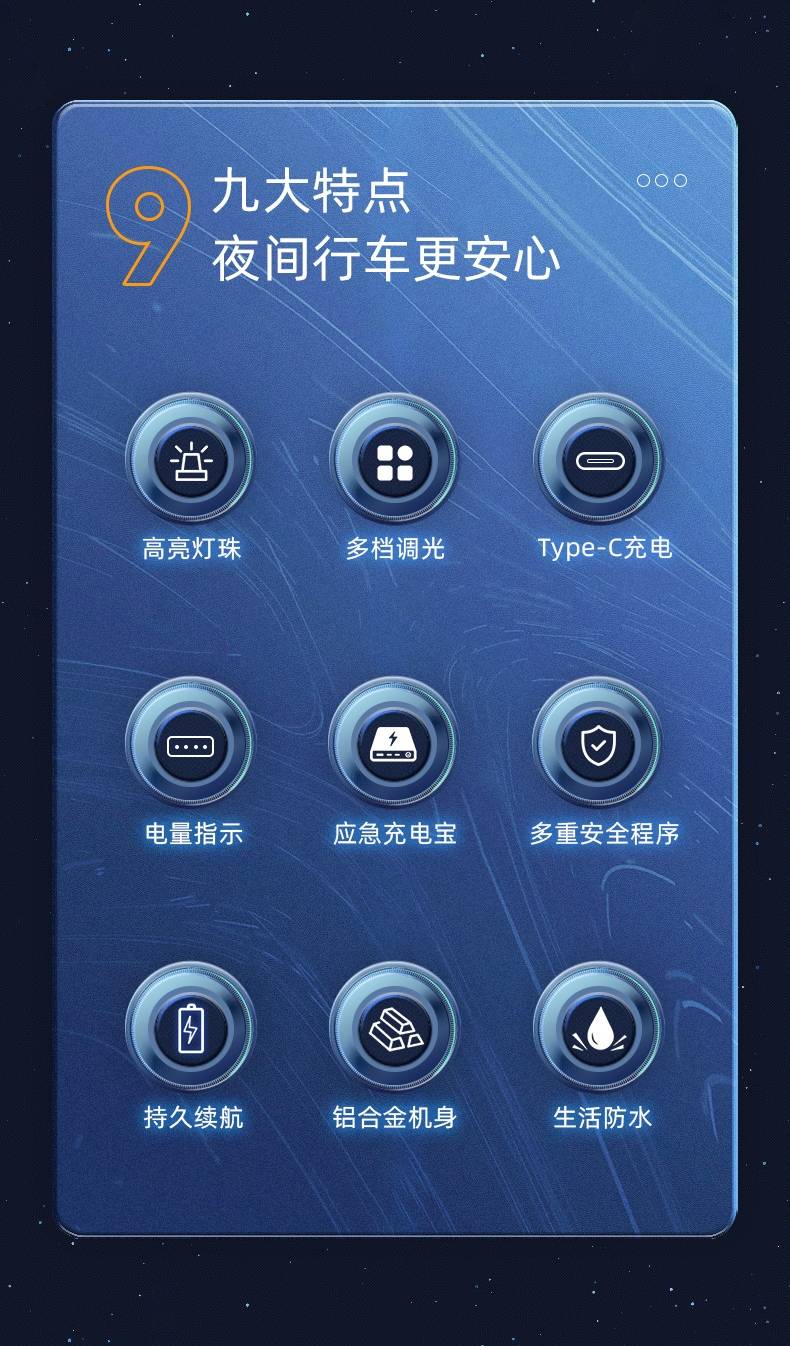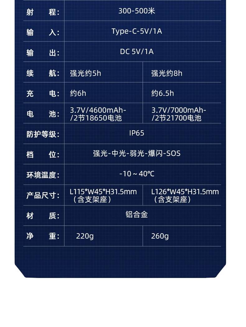 大容量电池,超长续航从容面对夜间户外作业 多档调光 一键切换 单击按键调光(强光-中光-弱光-爆闪-SOS-关闭),依次循环 Type-C便捷充电 照明时绿灯,低电量绿闪烁 电量即时显 一目了然 清晰显示屏数字化呈现电量,随时知晓剩余电量 续航长达46h