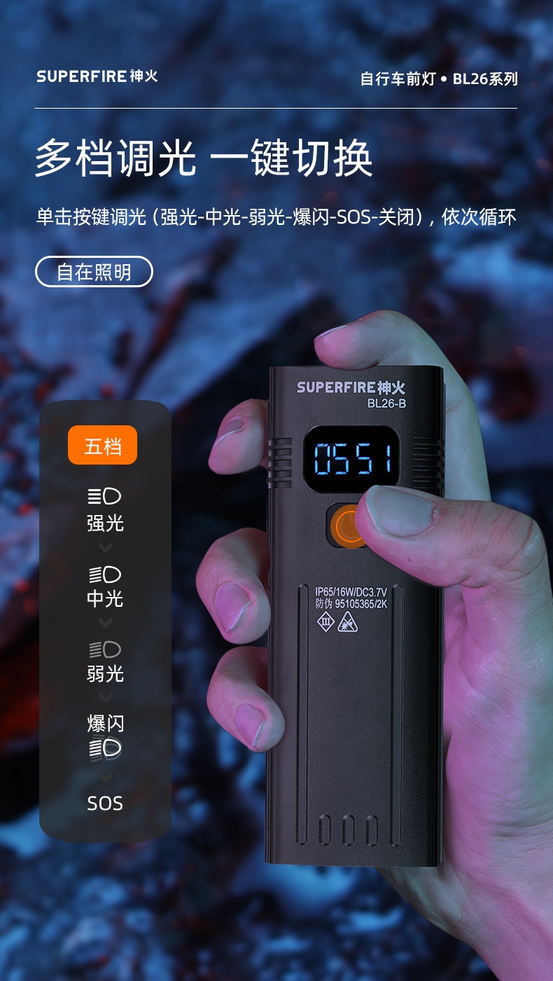 单击按键调光(强光-中光-弱光-爆闪-SOS-关闭),依次循环