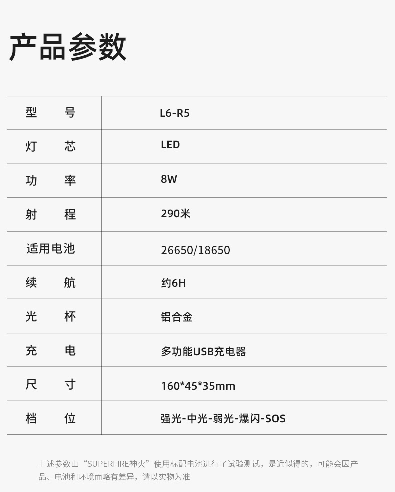 1、千米远射,射程更远,光斑更聚焦。 2、进口灯珠,亮度高,照明效果更好。 3、前后双按键,光源一键点亮,高亮瞬间开启。