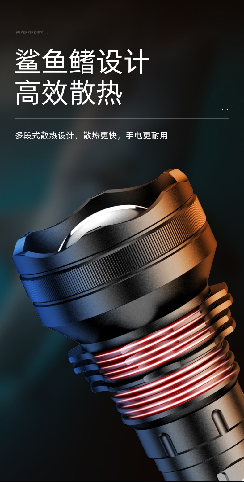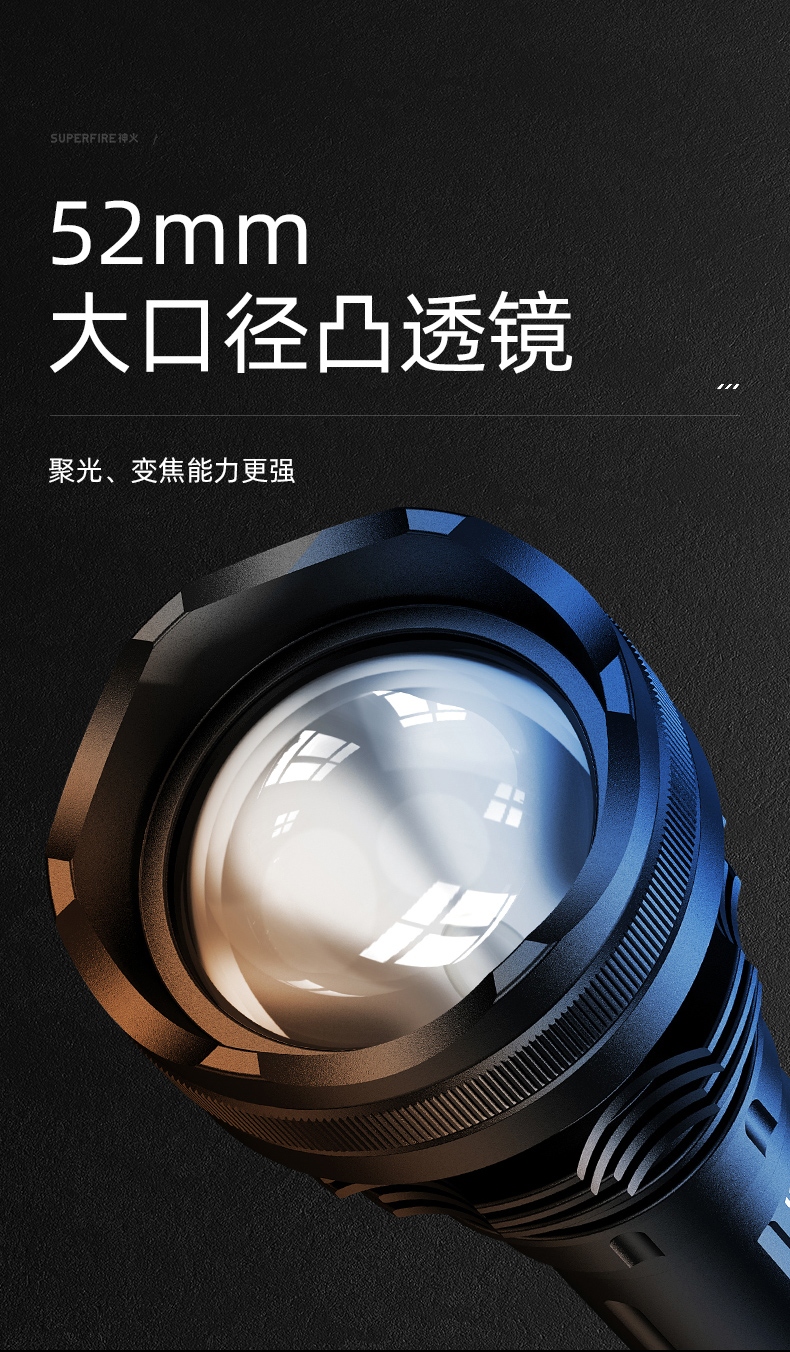 强光伸缩调焦,大功率灯芯,照射面积广。初始流明后,前2分钟维持初始亮度,第3-5分钟内省电完成到目标流明值。