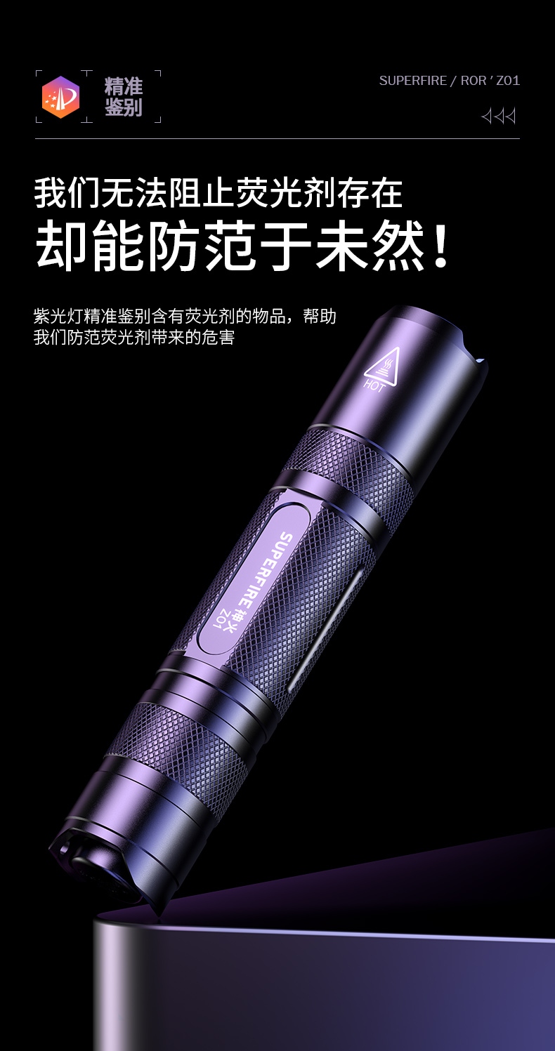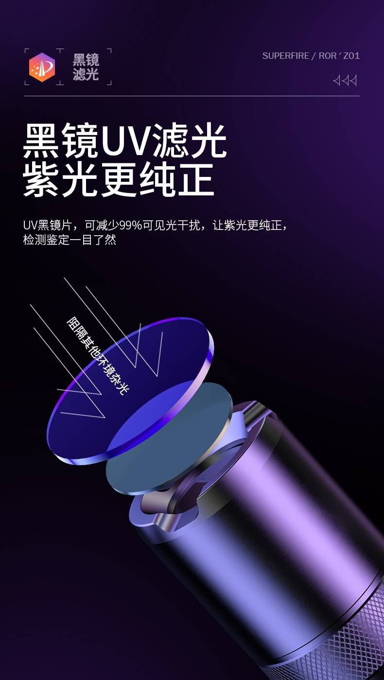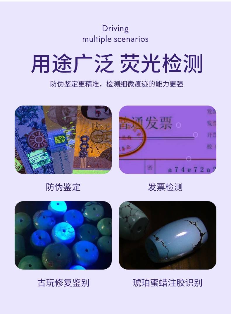 1、紫光手电,配有黑镜:可用于验钞、识别荧光剂,宠物病菌检测,鉴别琥珀、蜜蜡,古玩修补鉴定。