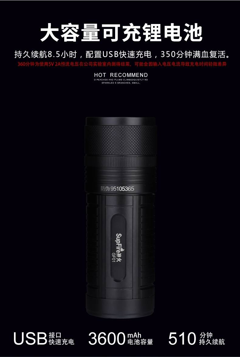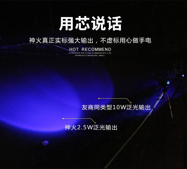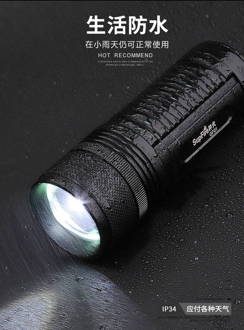 1、千米远射,射程更远,光斑更聚焦。 2、进口灯珠,亮度高,照明效果更好。 3、前后双按键,光源一键点亮,高亮瞬间开启。
